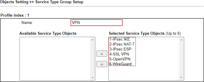 – W polu Service Type kliknij przycisk Edit, aby w nowym oknie wskazać grupÄ™ usÅ‚ug VPN.