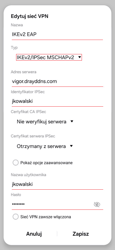 – protokół VPN: IPsec IKEv2 EAP-MSCHAPv2